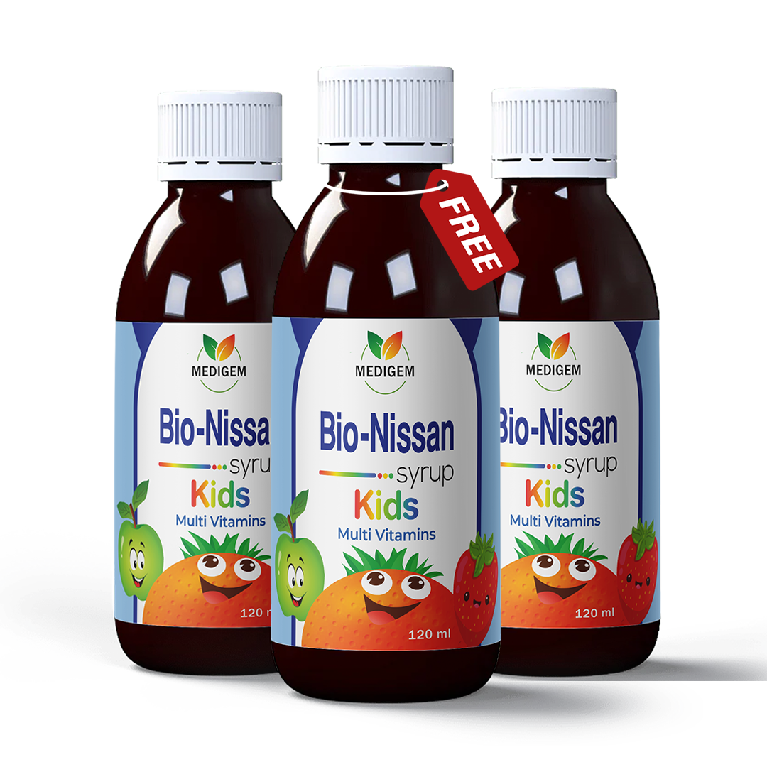 • BIO-NISSAN contains multivitamins, including vitamins A, D, C, E, and B-complex, that aid in the general health, growth, and development of children.